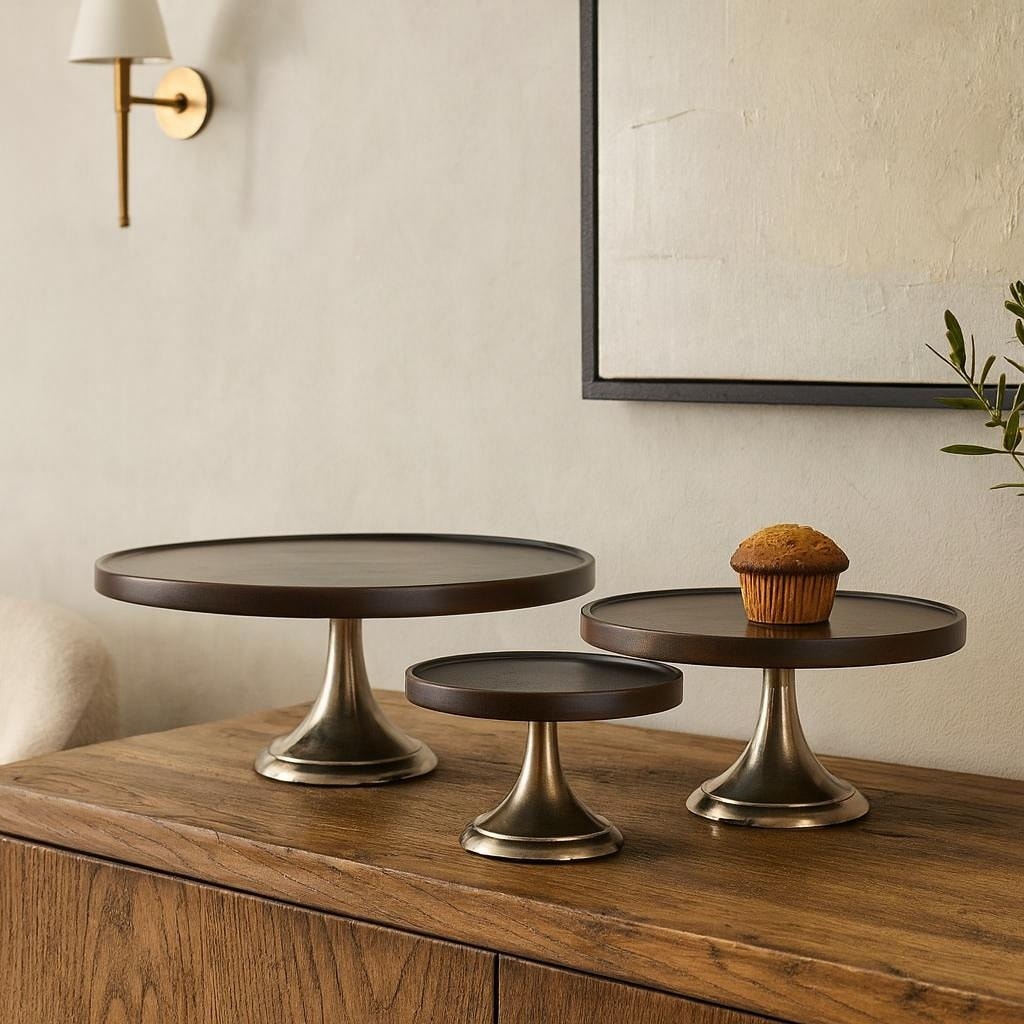 Brown or Dark Brown Mango Wood Decorative Cake Stand with Silver or Gold Aluminum Base (Set of 3)