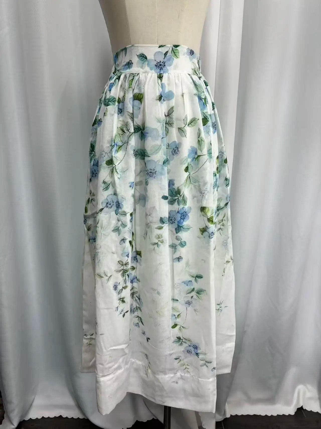 Watercolor Floral Linen High Waist Midi Skirt white l