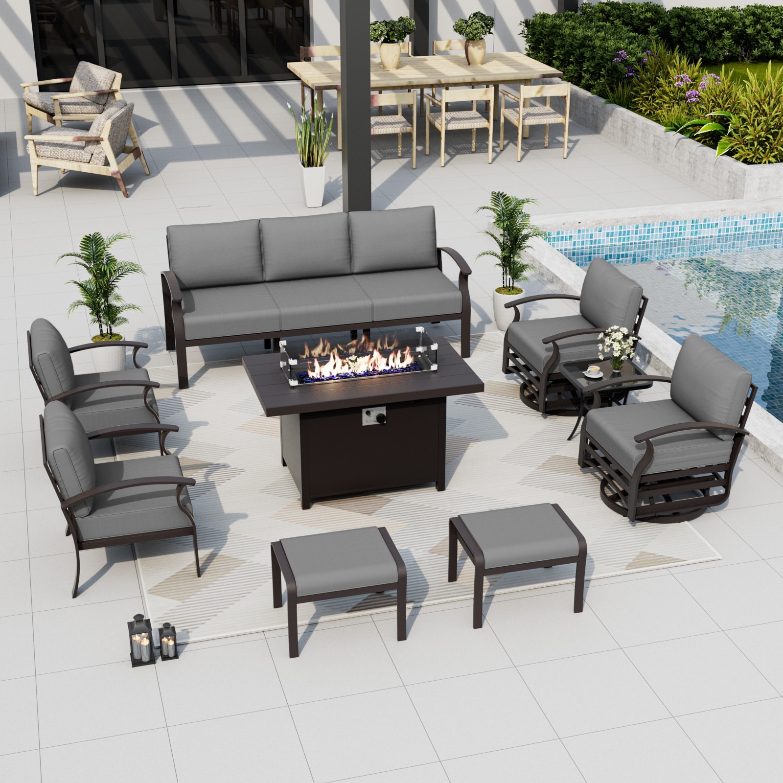 Aluminum Patio Furniture Set with Fire Pit, Ottomans & Rocking-Swivel Chairs, Modular Sofa with Thick Cushions