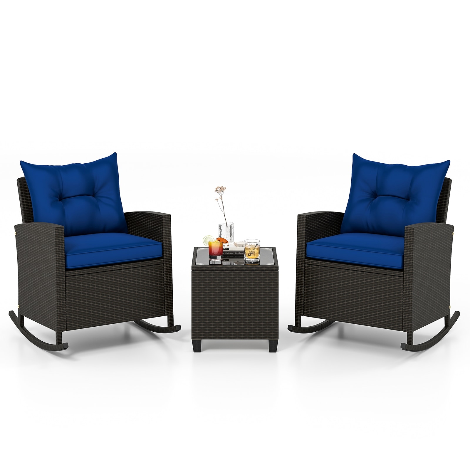Gymax Set of 3 Wicker Rocking Set Patio w/ Tempered Glass Table & Soft