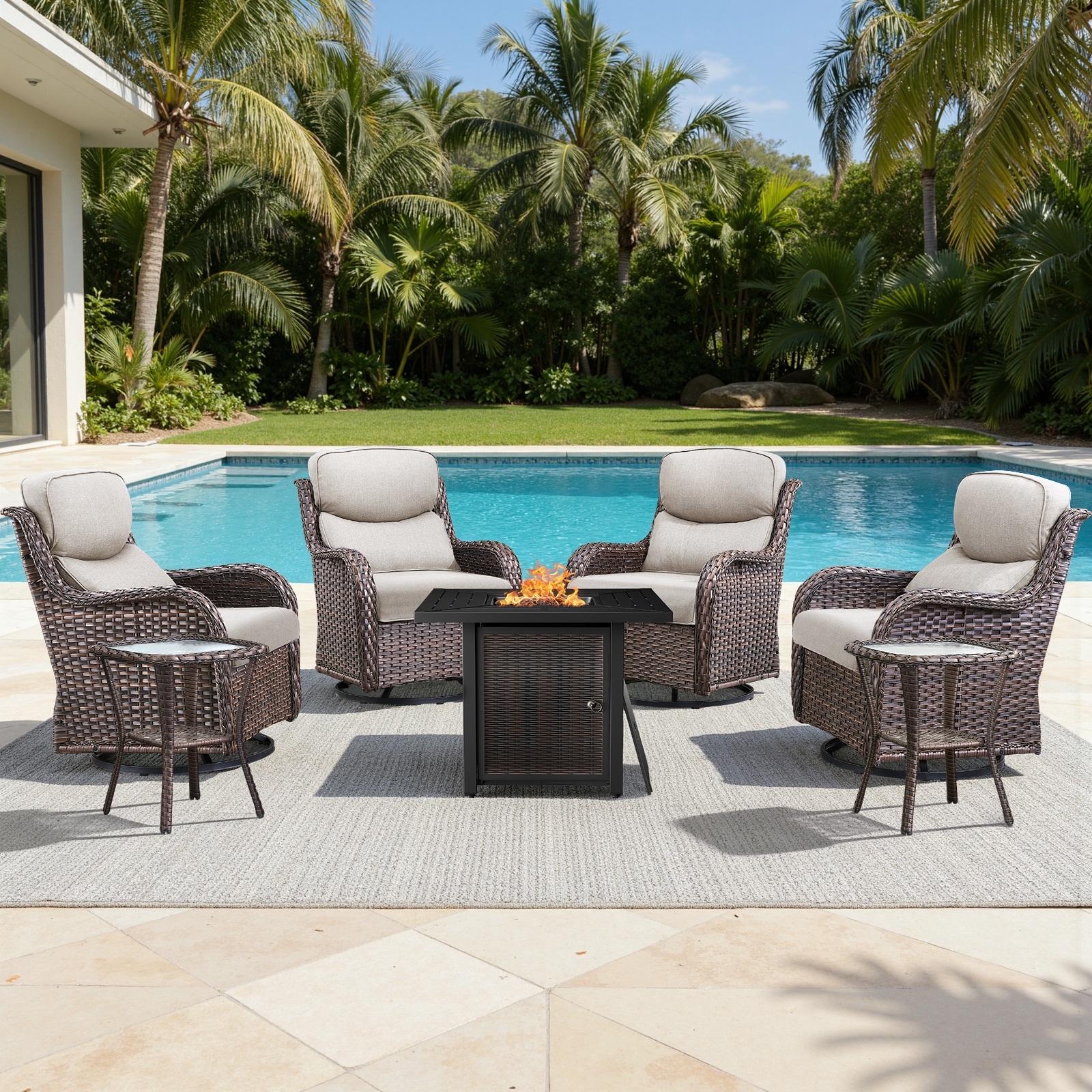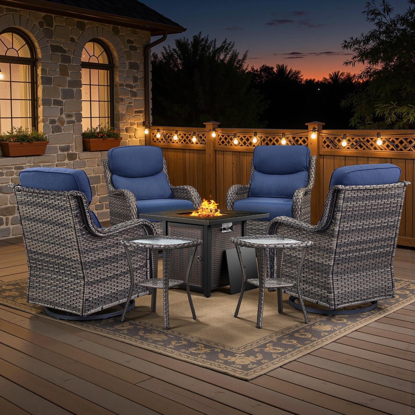 Meyreso 7-Piece Outdoor Patio Wicker Fire Pit 4 person Conversation Set with 5-Inch Thick Cushions