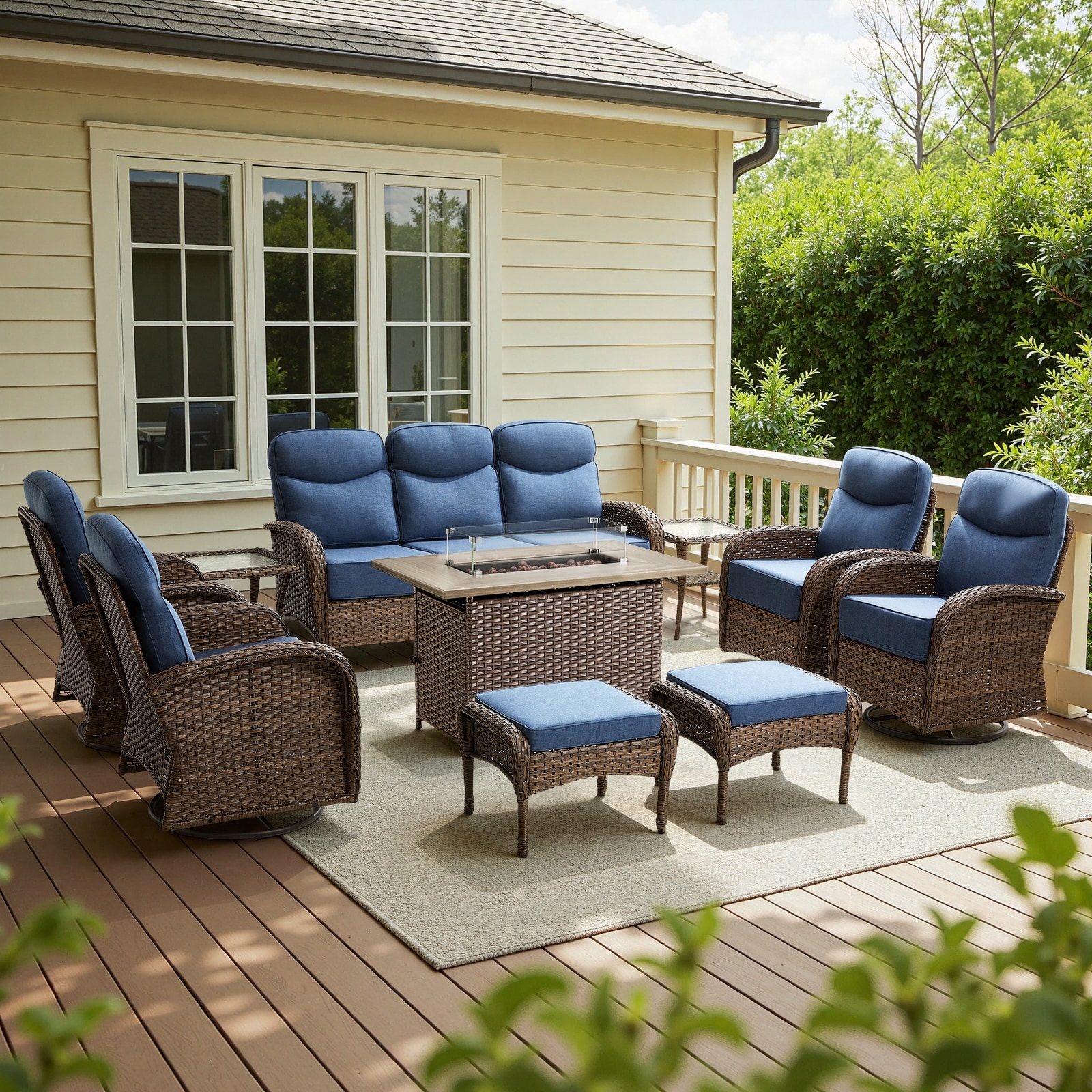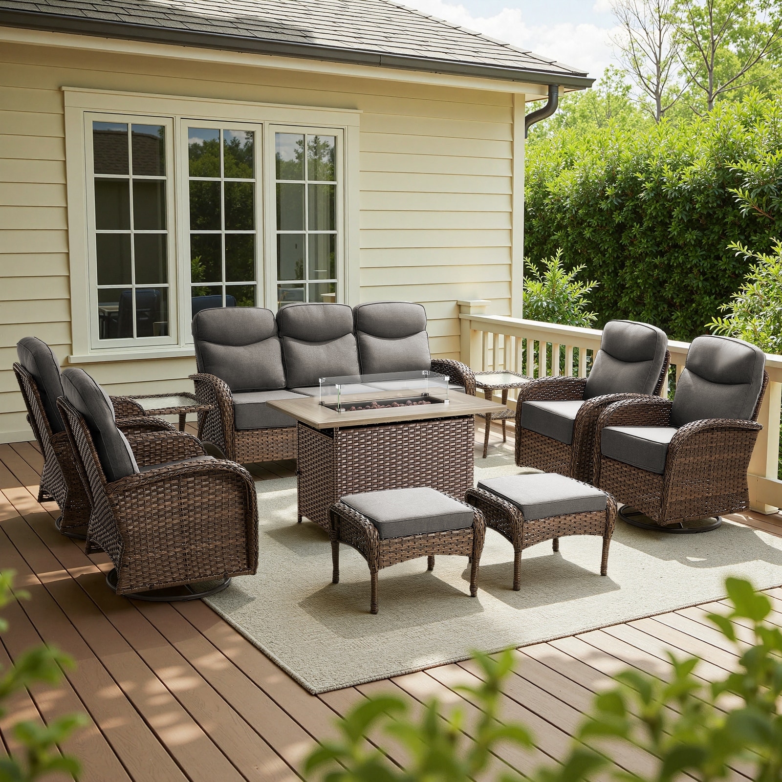 Gymojoy 9 - Person Fire Pit Outdoor Wicker Conversation Furniture Set with 6" Cushions, 55,000 BTU Propane Table