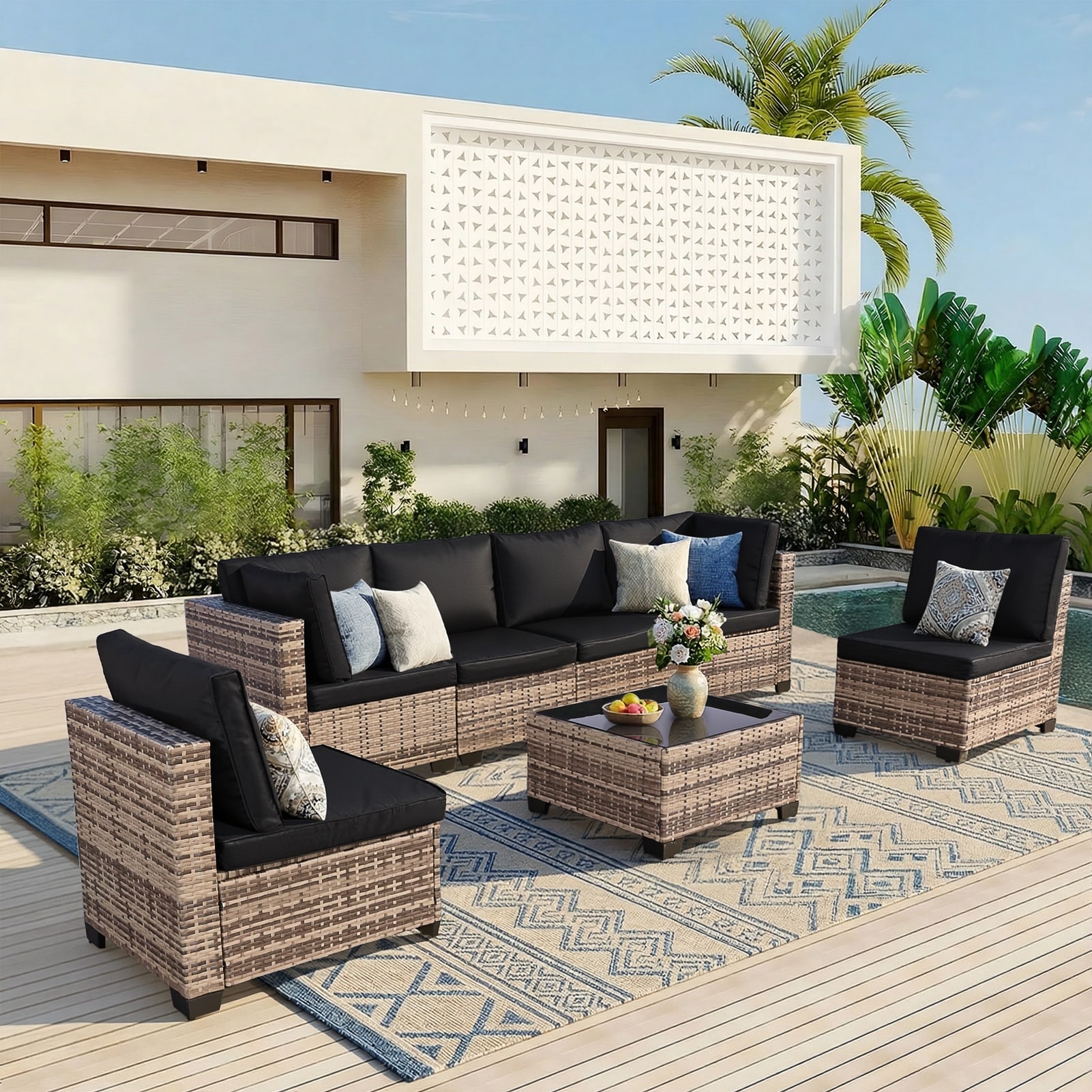 7-Piece Wicker Patio Conversation Set with Cushions,6 Sofas, 1 Table