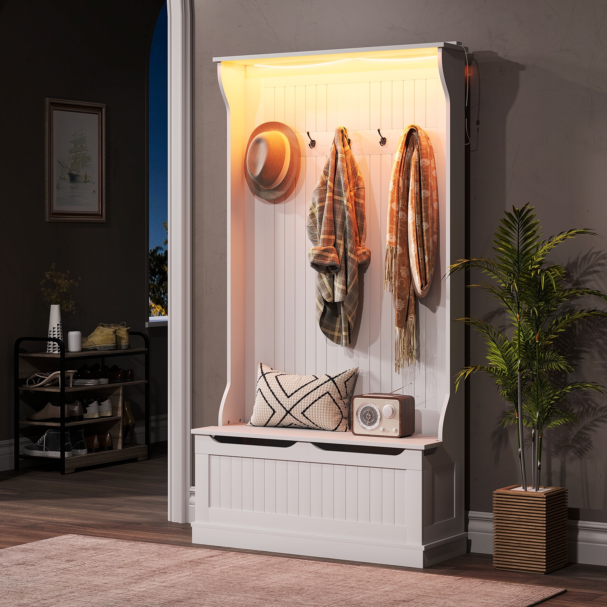 HOMCOM 3-In-1 Hall Tree with LED Lights and Shoe Storage, Standing Coat Rack with Shoe Bench, Entryway Organizer