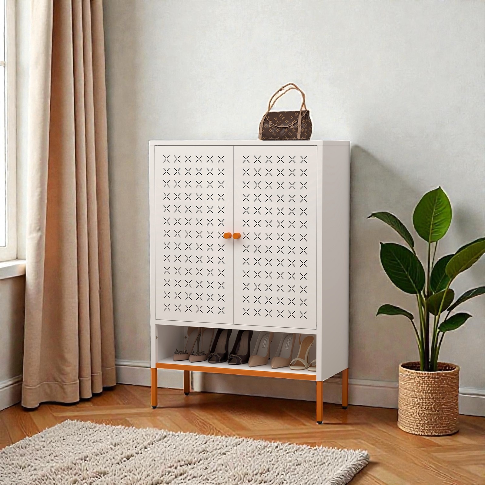 Metal Shoe Cabinet with Double Doors, Adjustable Shelves and Elevated Base, Freestanding Shoe Storage Cabinet for Entryway