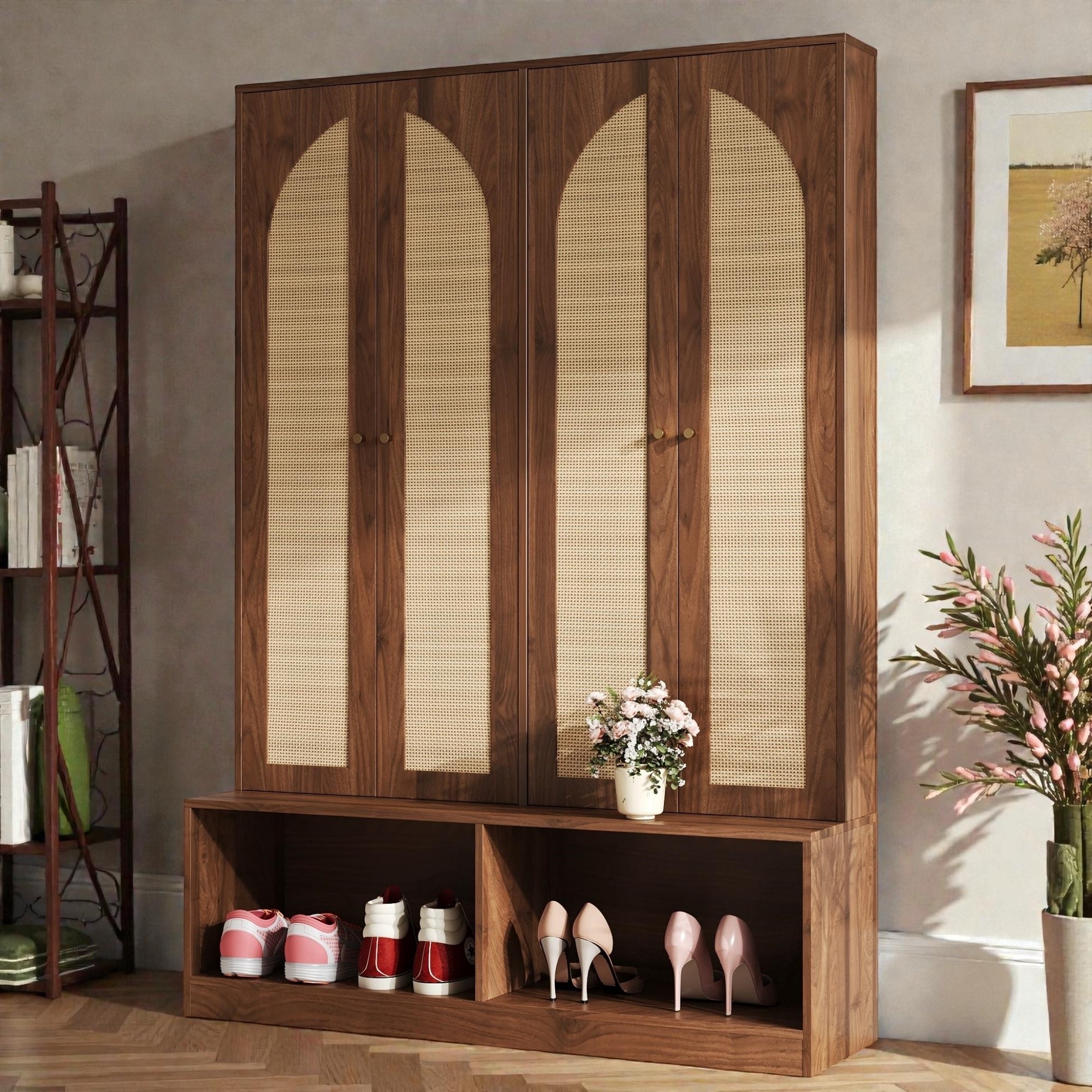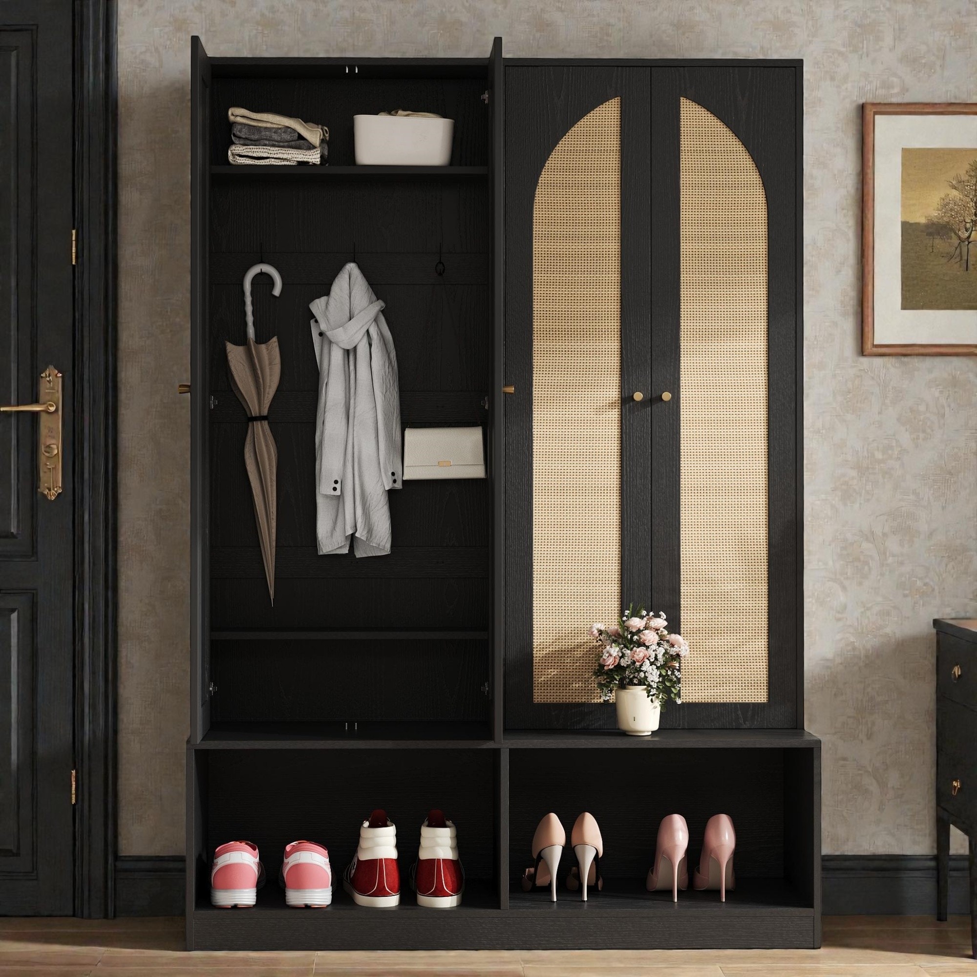 Boho Farmhouse Entryway Hall Tree with Bench, Rattan Doors, Adjustable Shelves, Hooks and Cabinets for Foyer and Mudroom - MDF