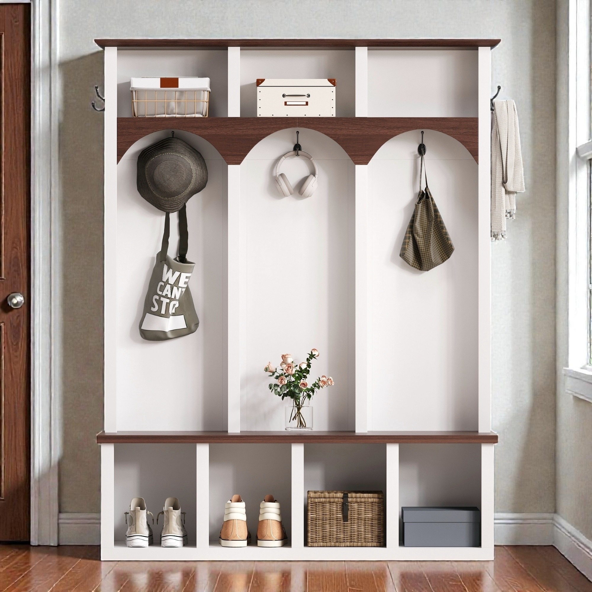 Farmhouse Hall Tree with Arched Design and Storage Bench, Entryway Shoe Cabinet with 5 Hooks and 7 Cubbies for Mudroom