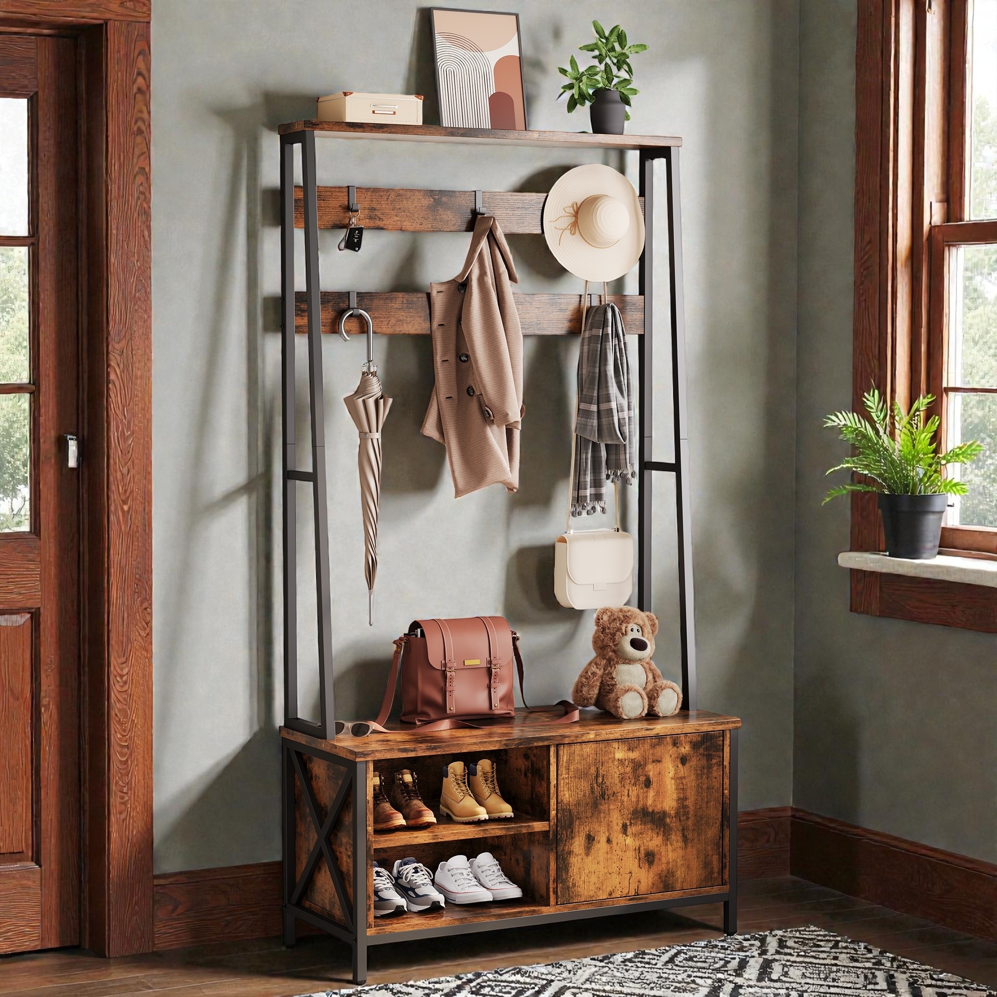 Clothes hanger Hall Tree Storage Bench Shoe Rack for Entryway,Hall Tree with Bench and Shoe Storage, with Rattan Door