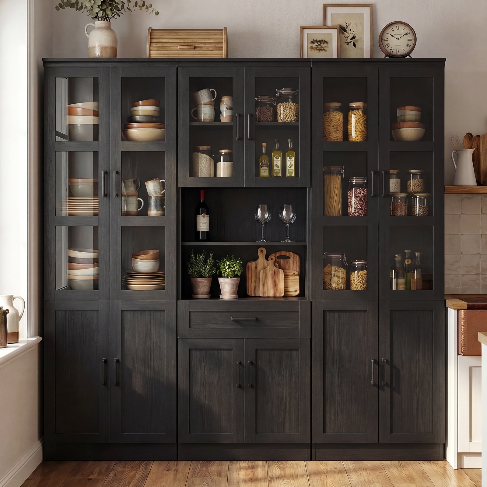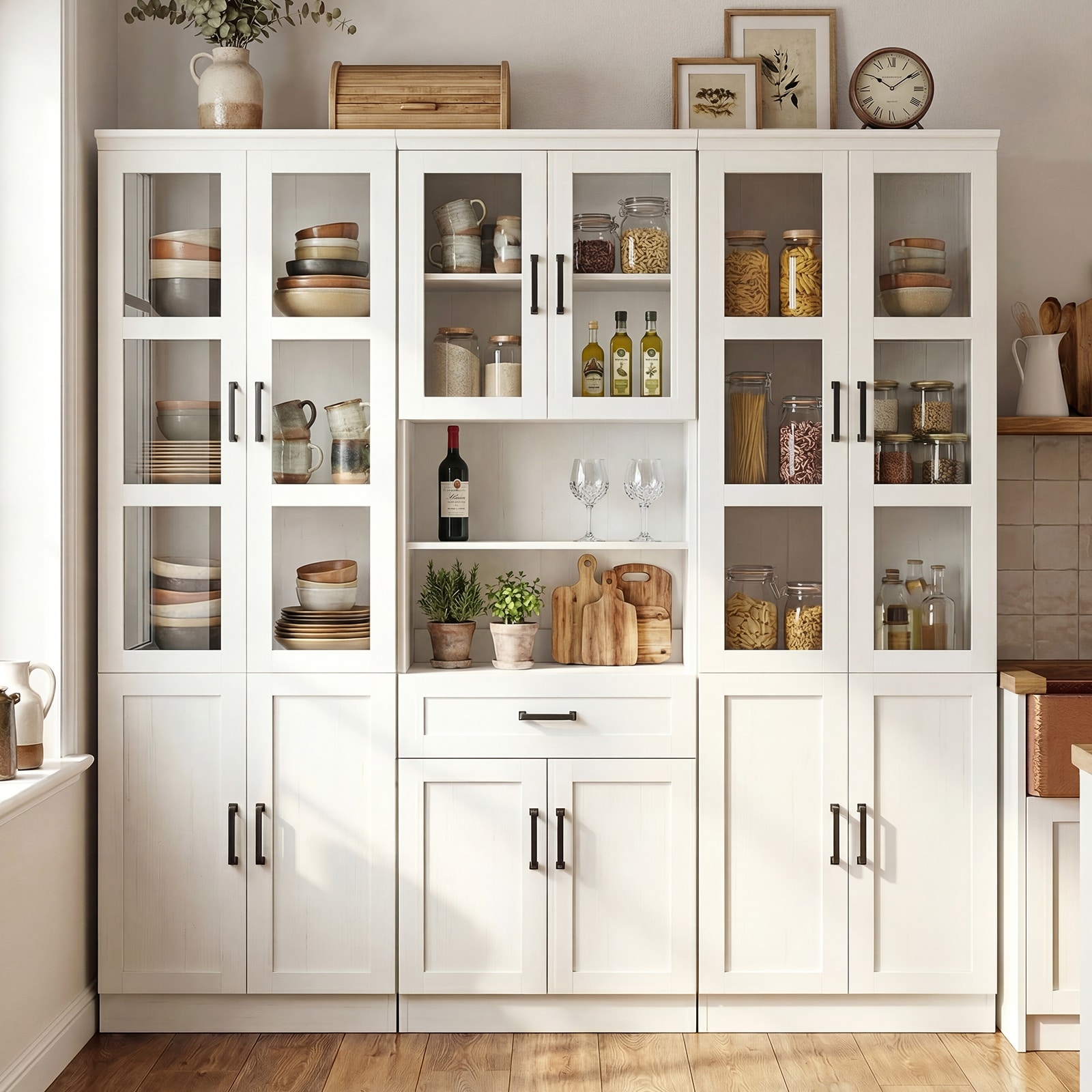 Set of 3 Wooden Kitchen Pantry Storage Cabinet, Tempered Glass Door, Adjustable Shelves, Drawer, 71" Wide, 80" Tall,12" Deep