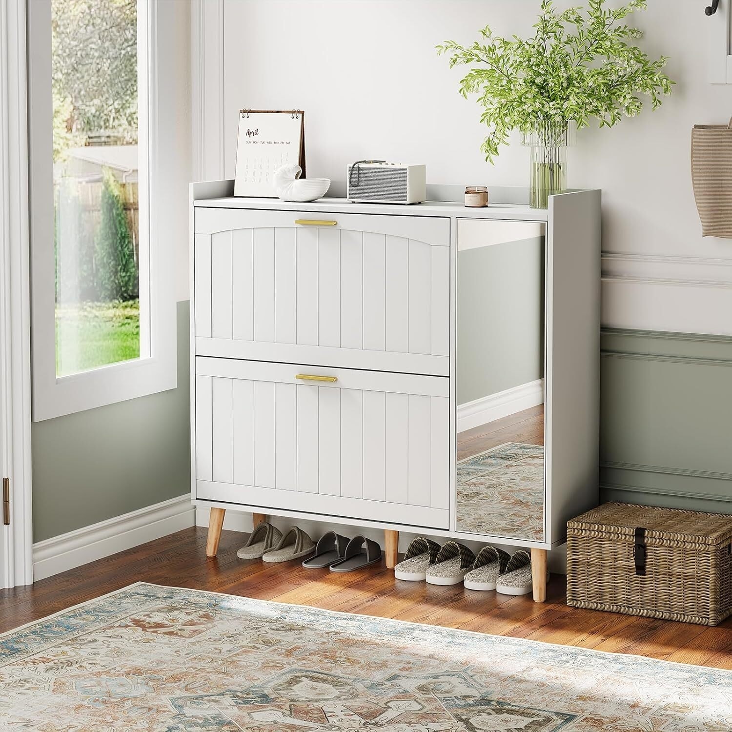Shoe Cabinet with Mirror, 2 Flip Drawers & Side Storage for Hallway, Bedroom