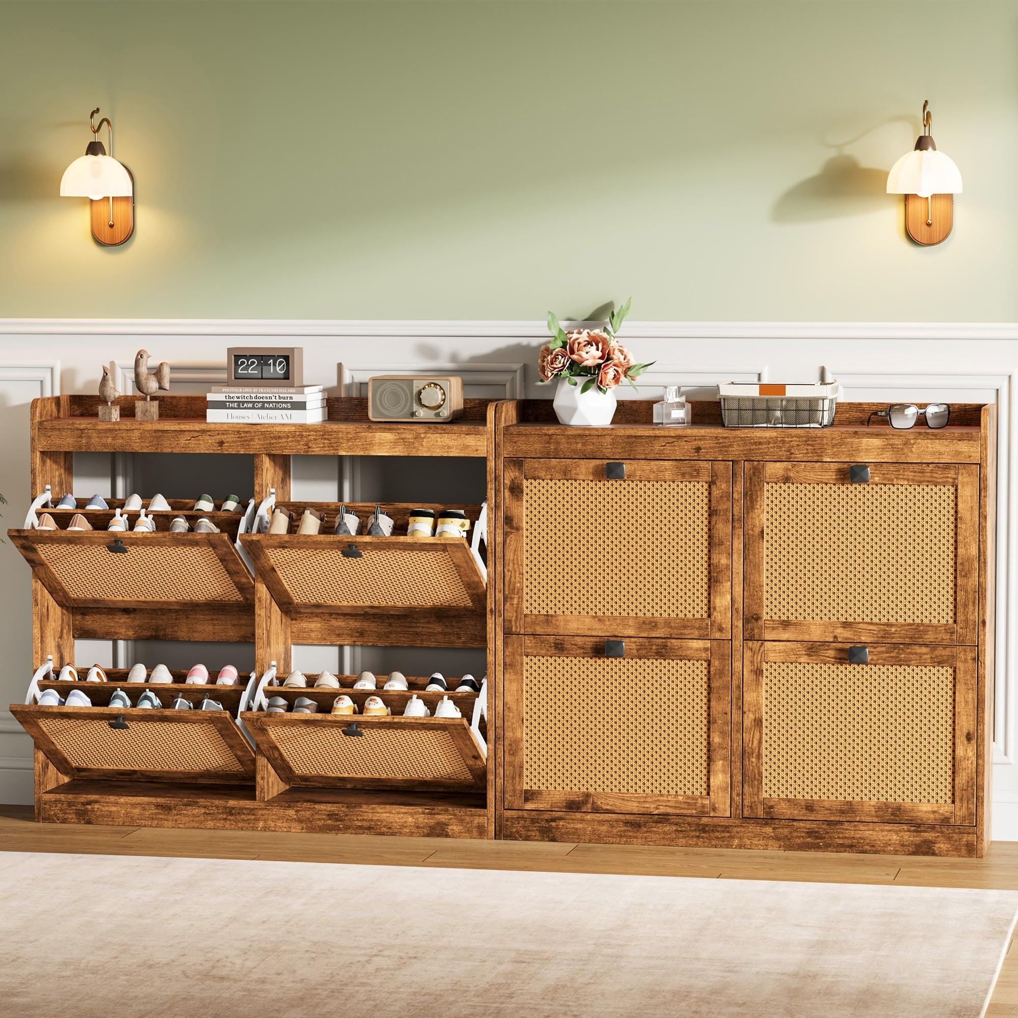 2 Pack Rattan Shoe Cabinet with 4 Flip Drawers, Adjustable Shelves, Freestanding Entryway Shoe Storage