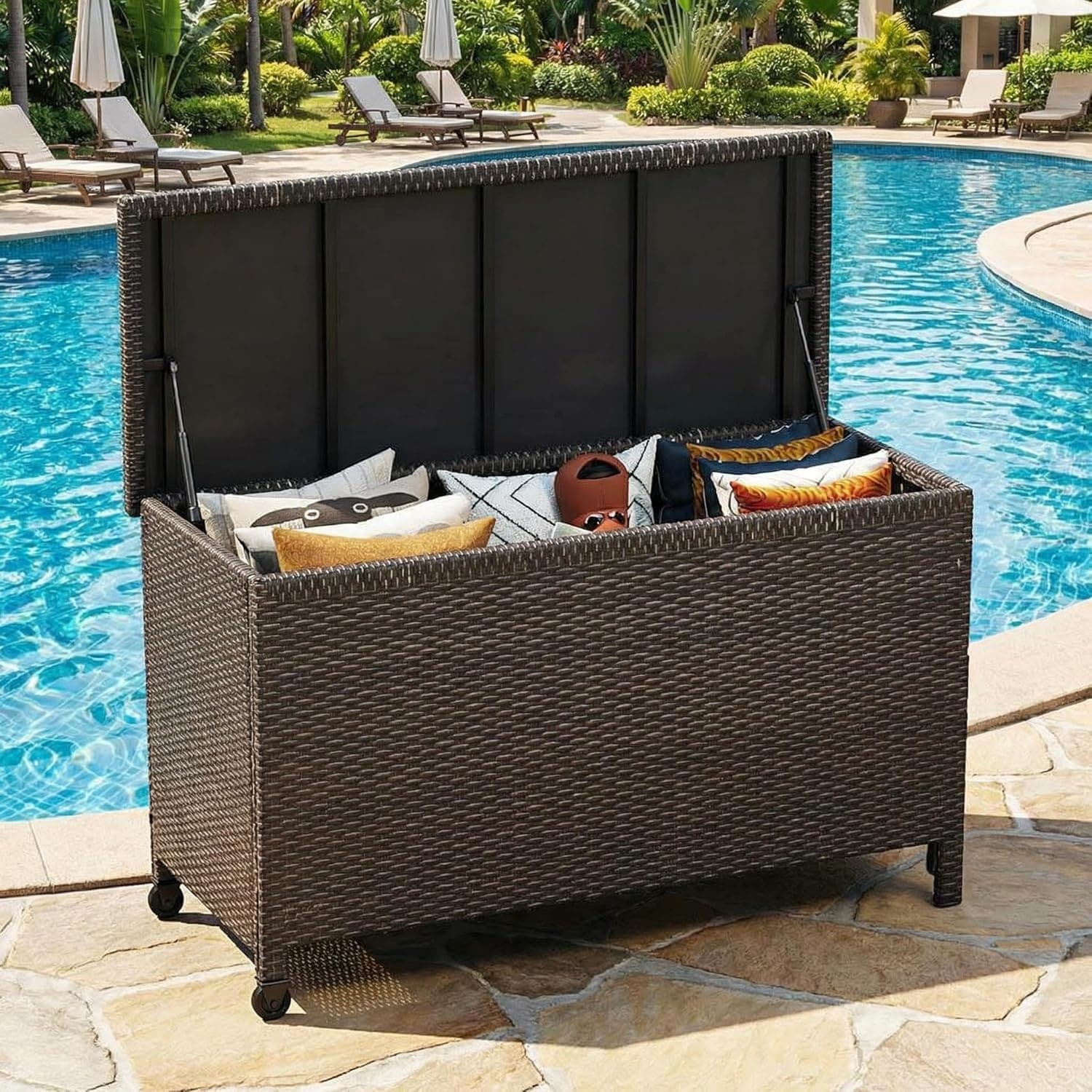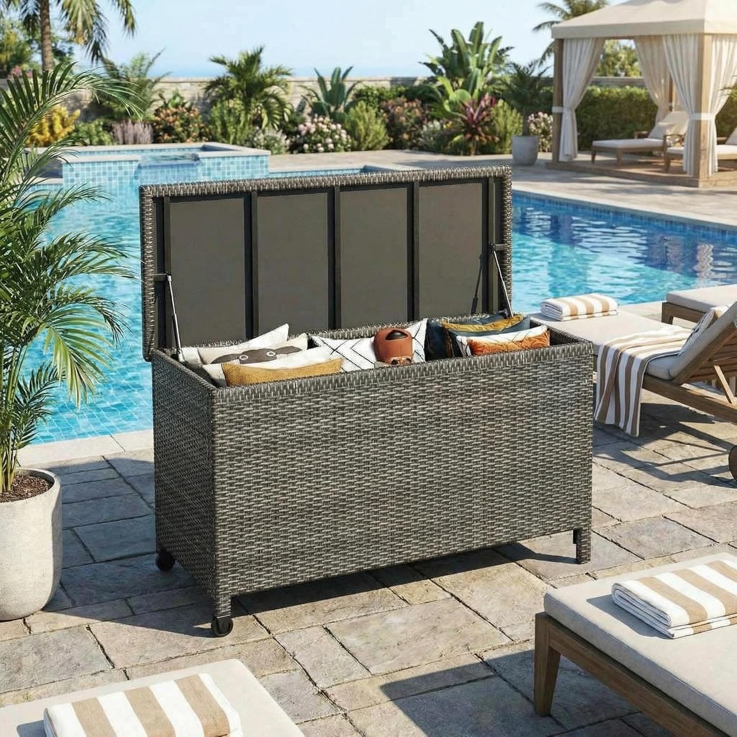 125 Gallon Wicker Deck Box, All-Weather Rattan Outdoor Storage Bin for Patio Cushions, Pool Supplies & Garden Tools