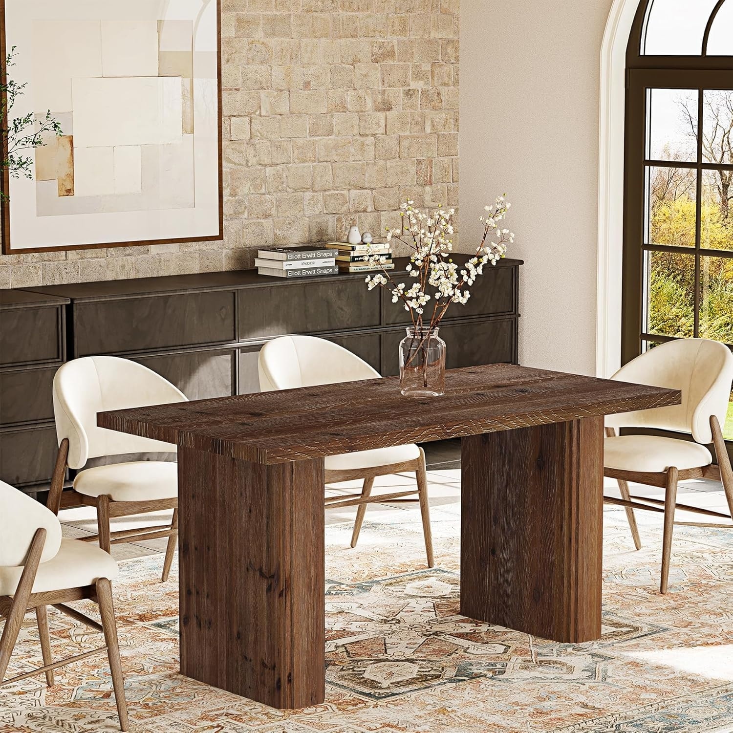63-Inch Solid Wood Dining Table for 4-6, Farmhouse Rectangular Kitchen Dinner Table with Robust Pedestal