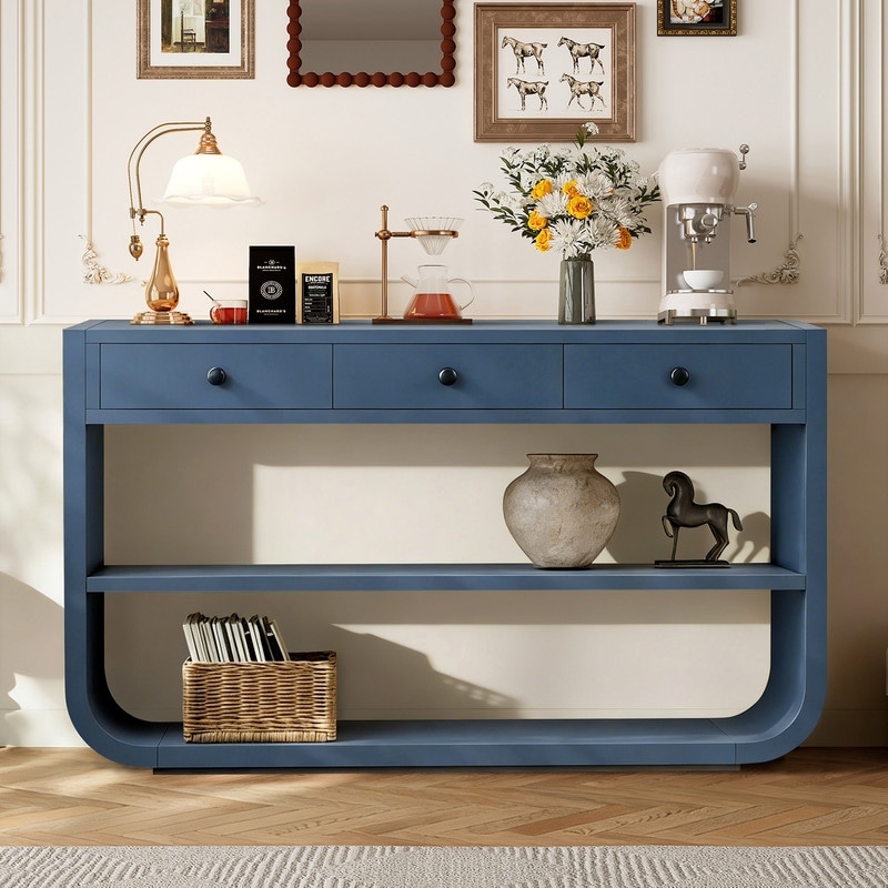 Mid-Century Modern Console Table with 3 Storage Drawers and Display Shelf for Entryway or Living Room Use